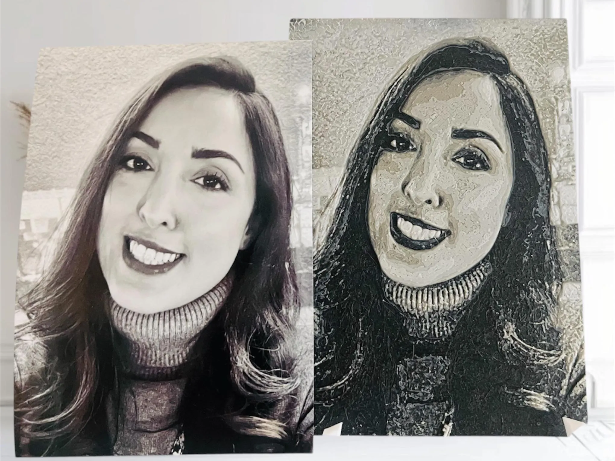We use a unique printing technique to transform your pictures or portraits into a unique 2.5D-printed artworks that play with light & color. A beautiful and original gift, or a piece of art to brighten up your space.